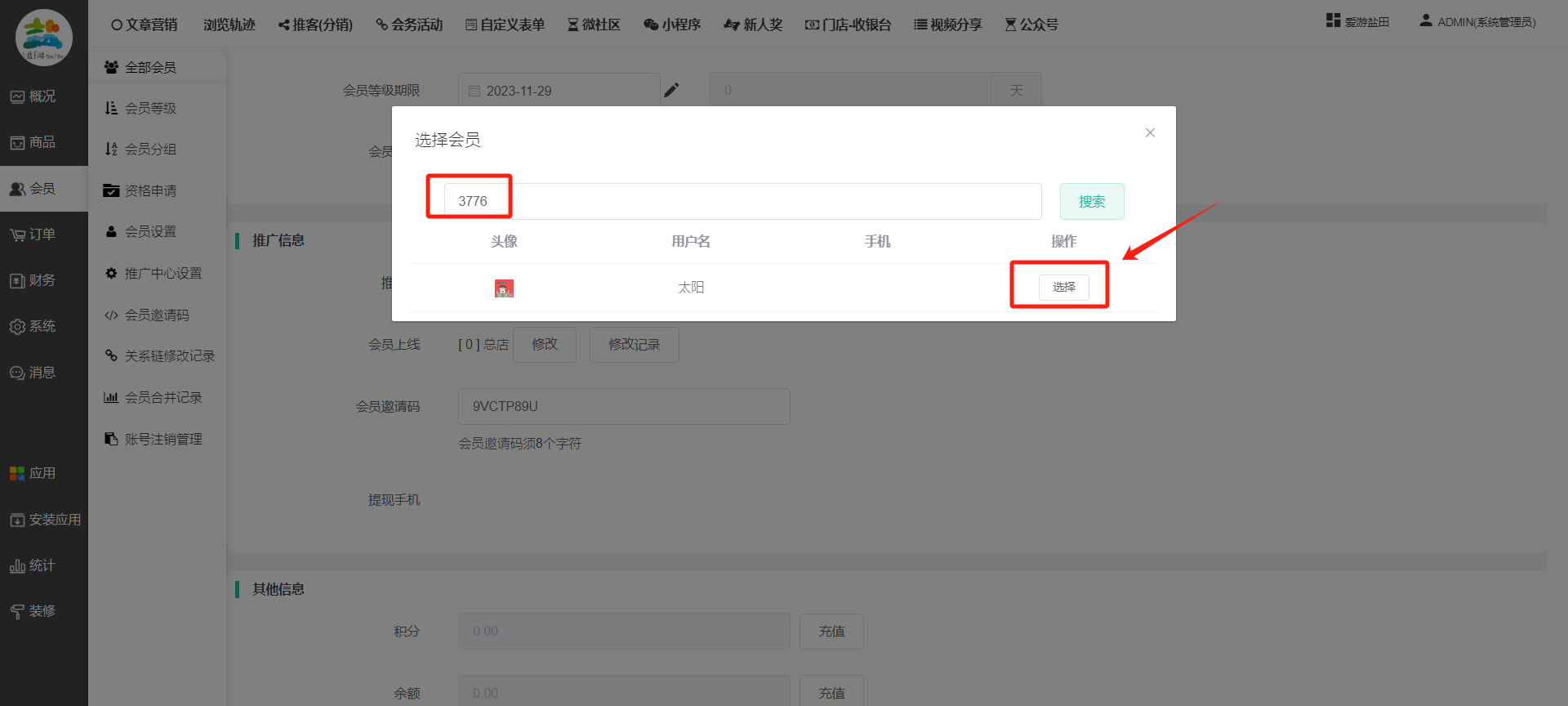 目录 搜索 展开 一、前期准备资料二、数字乡村码-上线操作指南1、服务号的申请流程及认证2、申请小程序流程3、开放平台绑定小程序和公众号三、数字乡村码-系统操作数字乡村码系统管理-概况数字乡村码-商品管理1、发布商品2、商品列表3、商品表单4、商品分类5、品牌管理6、配送模板7、评论管理8、优惠券管理9、商品标签10、退货地址设置11、满额优惠12、批量操作13、配送方式14、基础设置15、商品隐藏四、数字乡村码-会员管理1、全部会员2、会员等级3、会员分组4、资格申请5、会员设置6、推广中心设置7、会员邀请码8、会员关系链修改关系链修改记录9、会员合并记录10、账号注销管理11、会员设置中心五、数字乡村码-订单管理1、订单管理列表2、订单处理流程3、订单状态4、订单修改价格5、订单退款退货6、多包裹发货7、批量发货订单操作步骤8、催发货订单9、物流查询六、数字乡村码-财务管理1、余额设置2、会员余额3、充值记录4、转让记录5、余额明细6、收入明细7、提现设置8、提现统计9、积分管理10、转账审核11、收益广告12、批量充值七、数字乡村码-系统管理1、商城入口2、商城设置①、商城设置②、订单设置③、物流查询④、短信⑤、联系方式⑥、分类⑦、优惠券⑧、分享⑨、幻灯片⑩、广告位⑫、地图设置3、交易设置4、微信模板消息自定义消息模板(新版)自定义消息模板(旧版)小程序消息模板公众号模板消息变更公告5、语言设置6、权限管理7、多媒体管理八、数字乡村码-消息管理九、数字乡村码-应用管理十、数字乡村码系统-数据统计十一、数字乡村码-页面装修DIY1、模板管理2、店铺页面3、顶部导航4、底部导航5、DIY模板市场6、首屏广告7、基础设置8、装修DIY尺寸建议十二、供应商功能插件操作指南1、供应商2、门店-收银台门店申请和使用步骤门店管理①、门店-收银台 营销设置②、门店-收银台 分润设置门店分类门店申请门店审核门店商品门店商品订单收银台订单数据统计核销员基础设置默认设置门店装修3、微社区4、会务活动十三、营销插件操作指南活动报名提货卡新人奖微店问卷调查积分视频分享1、视频分享基础设置2、视频分享发现管理3、视频分享分类管理4、视频分享评论管理5、视频分享分红记录6、视频分享短视频中心每日红包幸运大抽奖签到优惠券二维码任务奖励优惠劵文章音频文章付费文章限时购新海报拓客卡操作流程积分活动素材中心视频红包十四、入驻门店应用类1、门店预约2、附近商品3、门店定位设置4、门店控制5、门店满额包邮6、门店满额减7、导入商品8、门店搜索9、门店股东10、核销券11、多门店核销1、商城后台设置2、前端功能演示十五、常见问题1、后台登录密码修改流程2、会员-余额,积分,后台如何进行充值与扣除3、如何修改上下级关系4、一种万能的获取商城小程序路径的方法 暂无相关搜索结果! 阅读次数:1472 本文档使用 模王系统 发布 8、会员关系链修改 8、会员关系链修改一.如何修改上下级关系?1.会员-全部会员-可以通过搜索用户的独立ID,或者用户微信昵称,找到此会员,然后点击右边的(操作)2.再点击会员详情。3.滑到下面,有个推广信息-会员上线,点击修改4.输入上级的ID号,点击搜索,出来此上级会员后点击选择。5.滑到最下面,一定要点击提交按钮。文档更新时间: 2023-11-30 14:56 作者:链上旅行