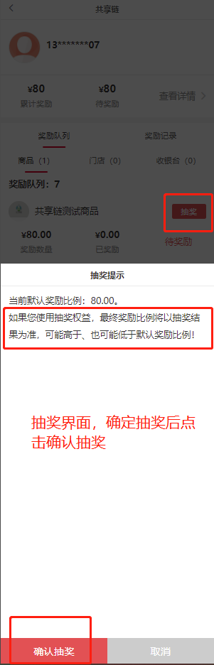 会员前端共享链界面,可点击抽奖功能抽取其他待返奖励比列。