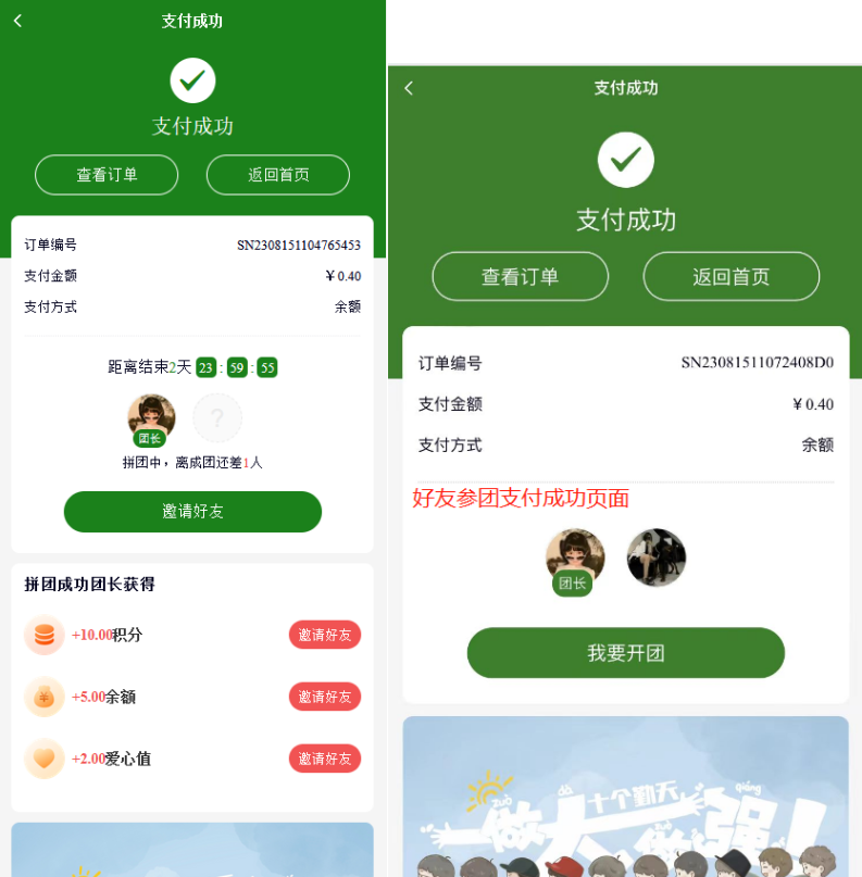 9、拼团订单:显示拼团截止时间、拼团信息;开团订单还会显示拼团团长奖励信息
